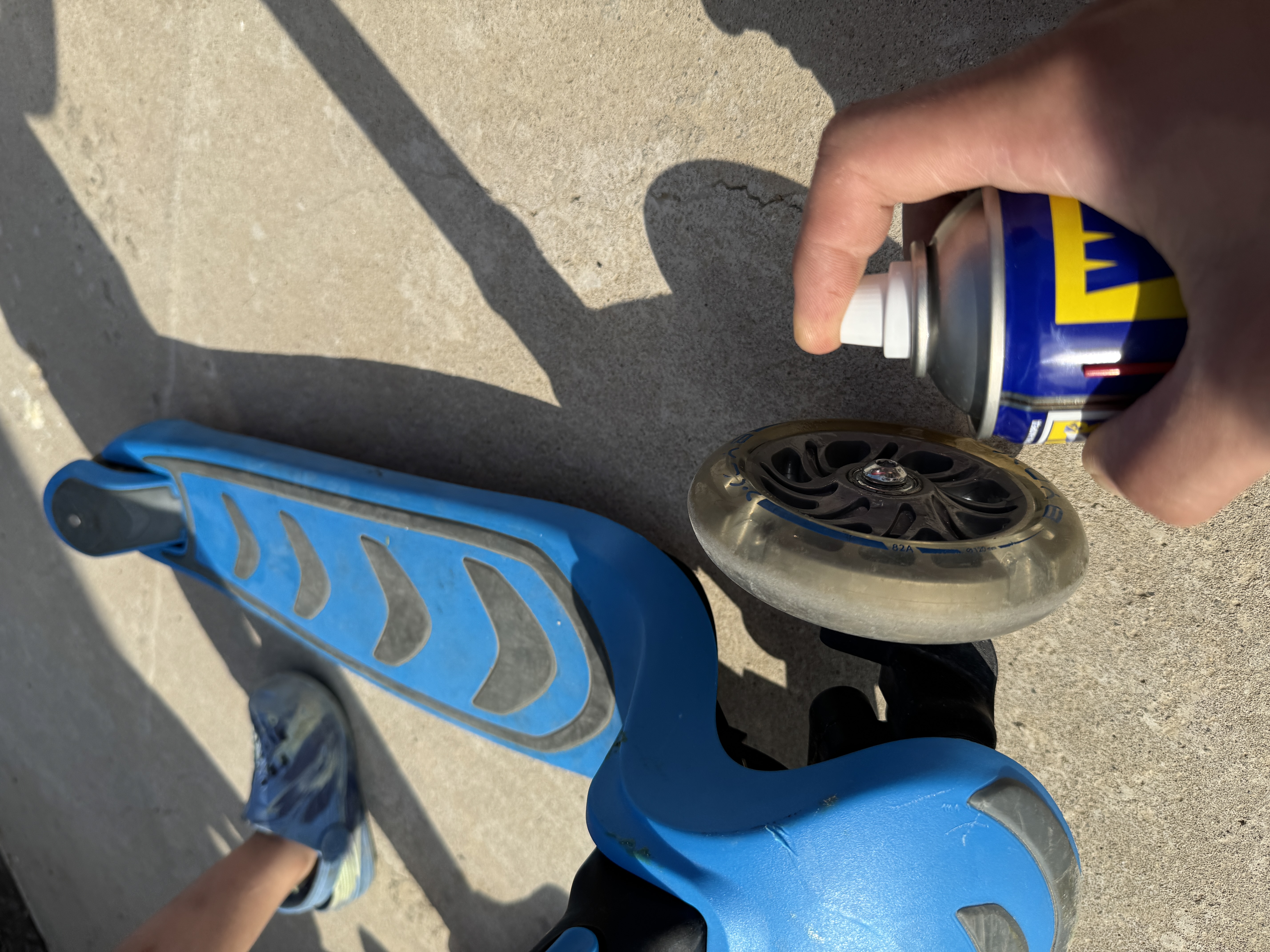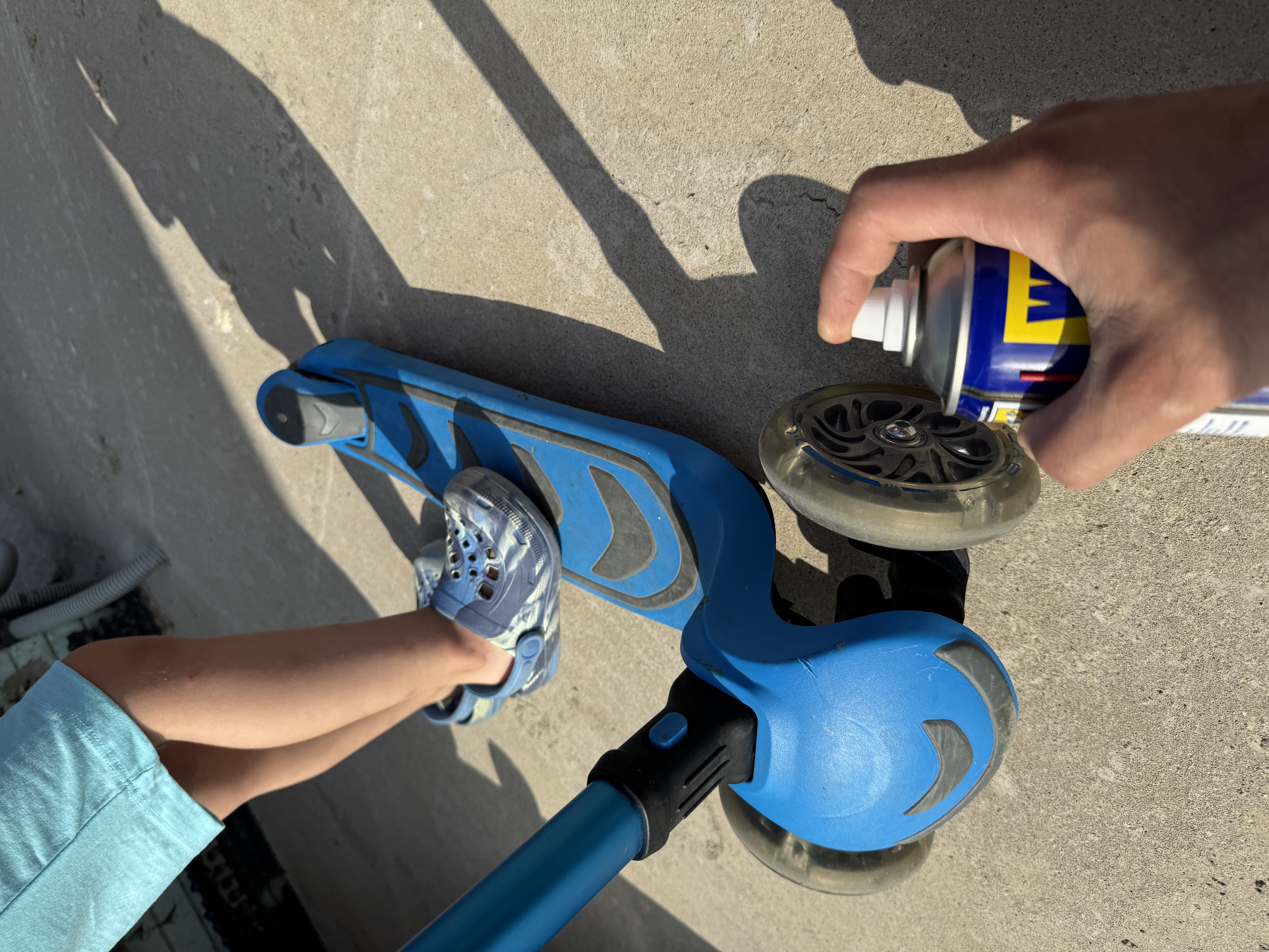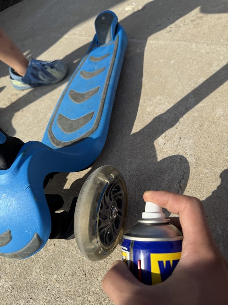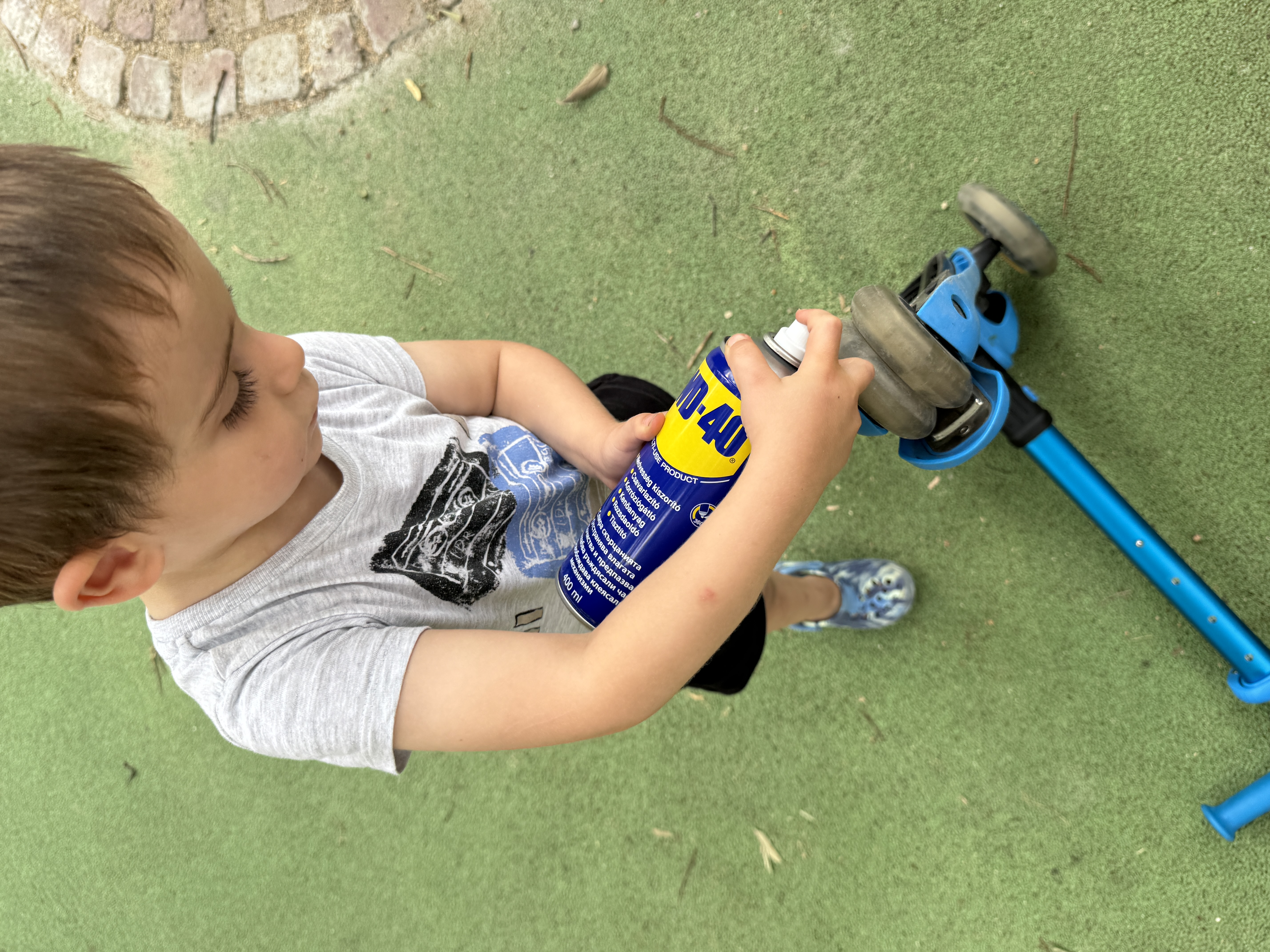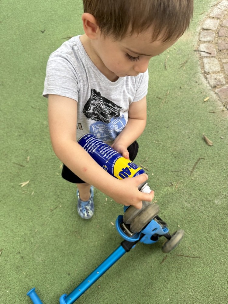 Нашата игра с моето 2 годишно дете е свързана с почистване на колелетата от мръсотия и ръжда, смазването им и приготвянето им за лятото. Включва смазването на всичките 4 колела на тротинетката му и премахването на наслагваната прах и фини частици затлачващи лагерите и всички ръждясали компоненти по тротинетката. Лесно, бързо и ефективно като детска игра, за да продължи детството :)