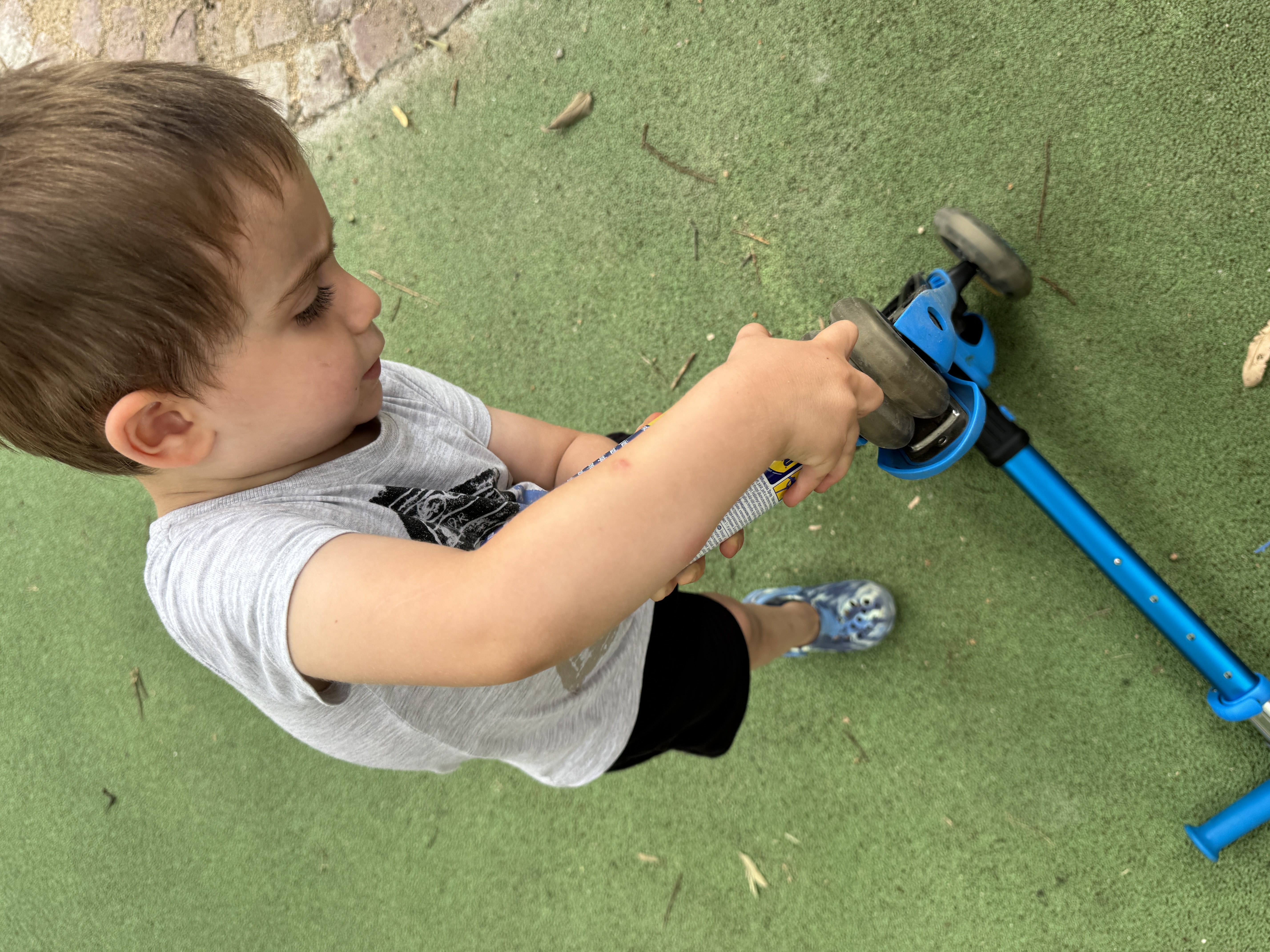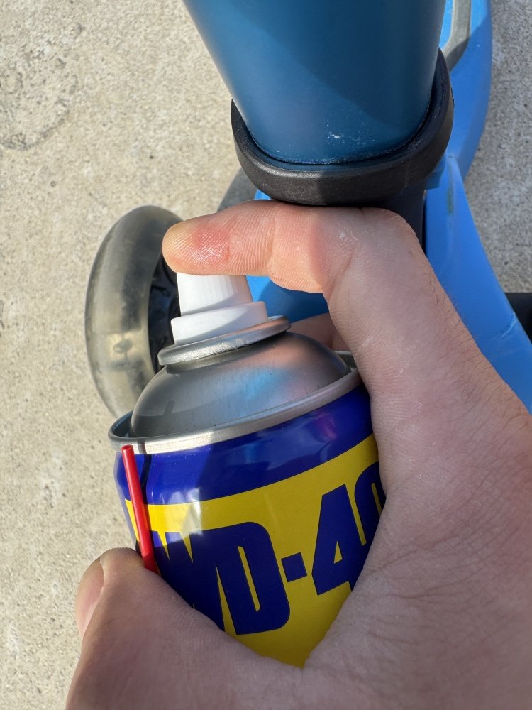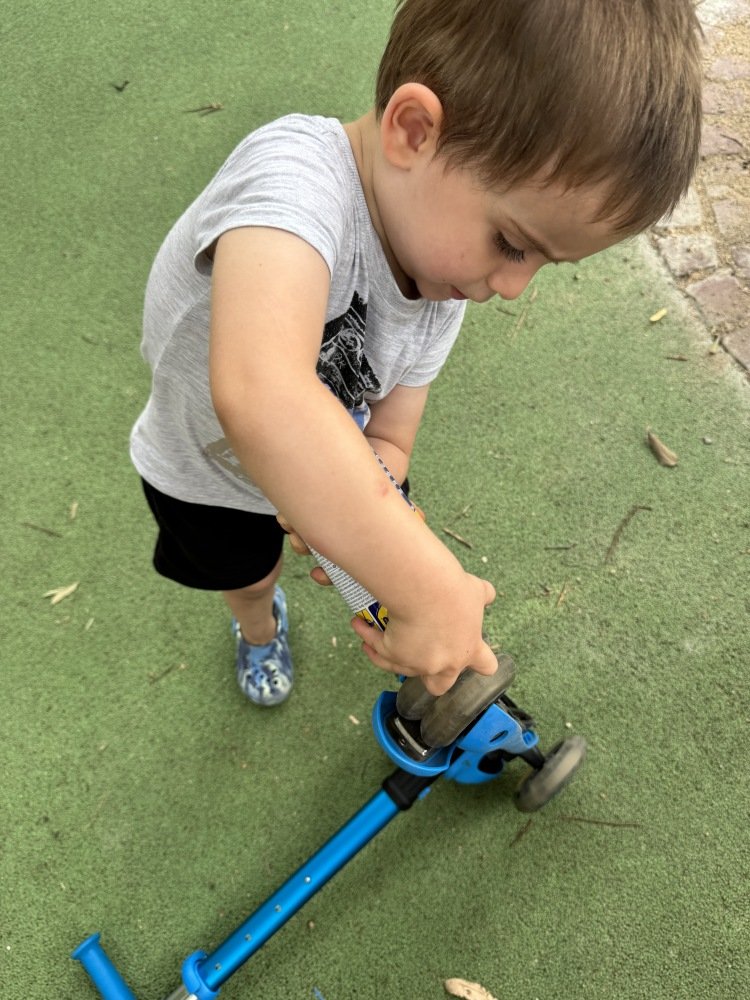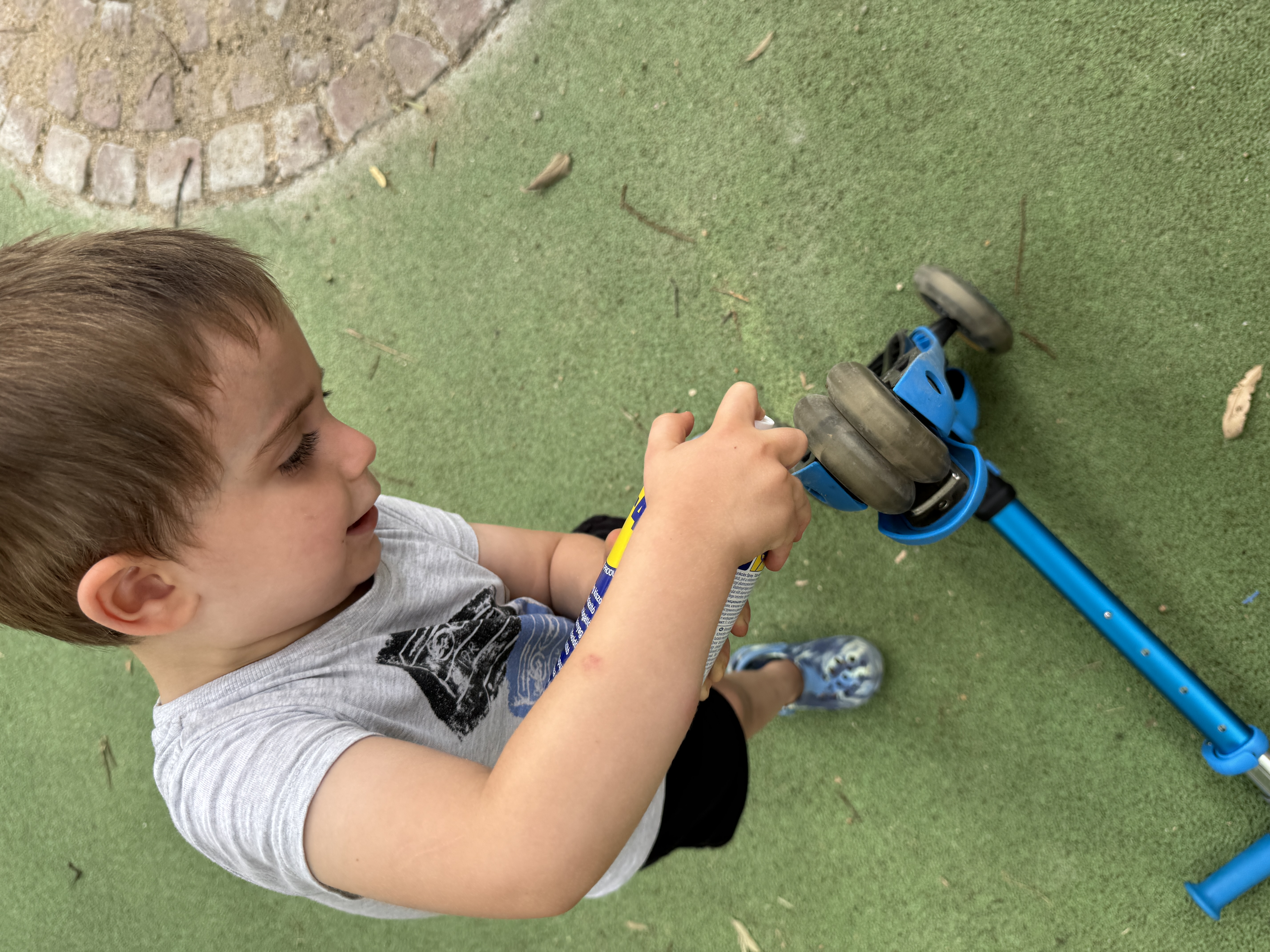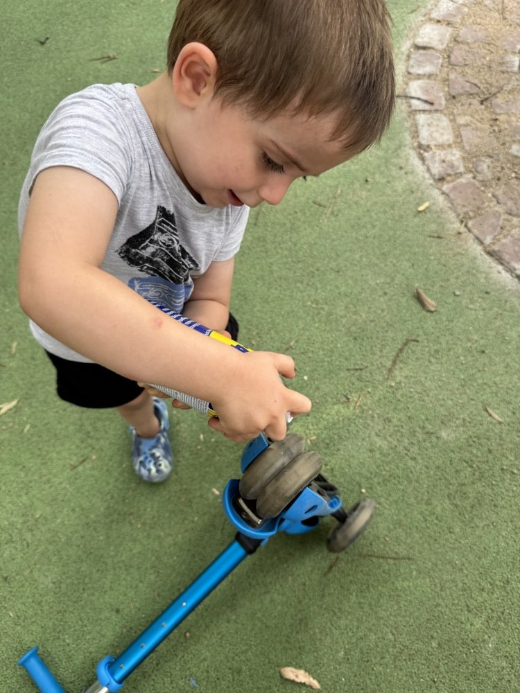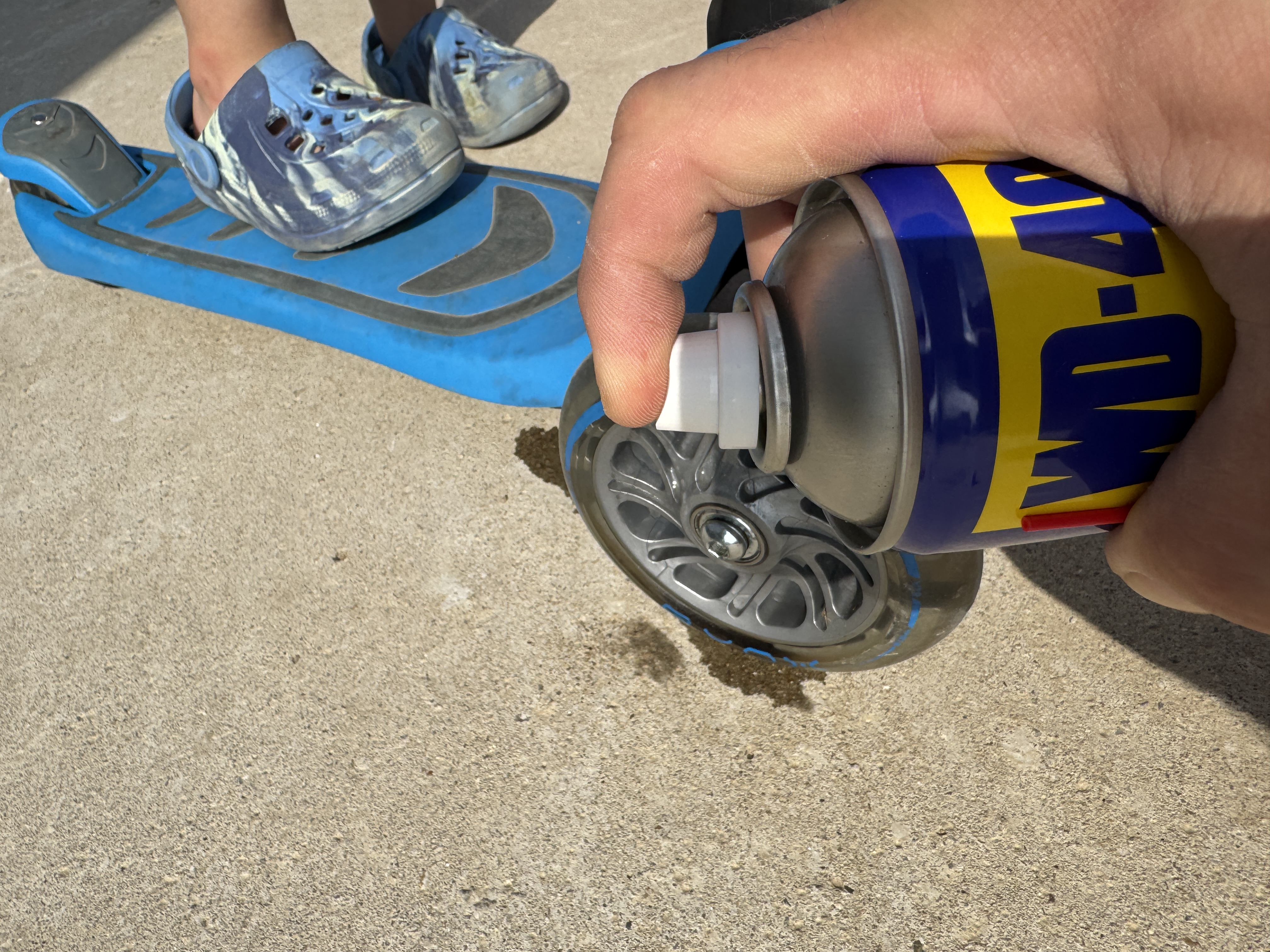 Нашата игра с моето 2 годишно дете е свързана с почистване на колелетата от мръсотия и ръжда, смазването им и приготвянето им за лятото. Включва смазването на всичките 4 колела на тротинетката му и премахването на наслагваната прах и фини частици затлачващи лагерите и всички ръждясали компоненти по тротинетката. Лесно, бързо и ефективно като детска игра, за да продължи детството :)