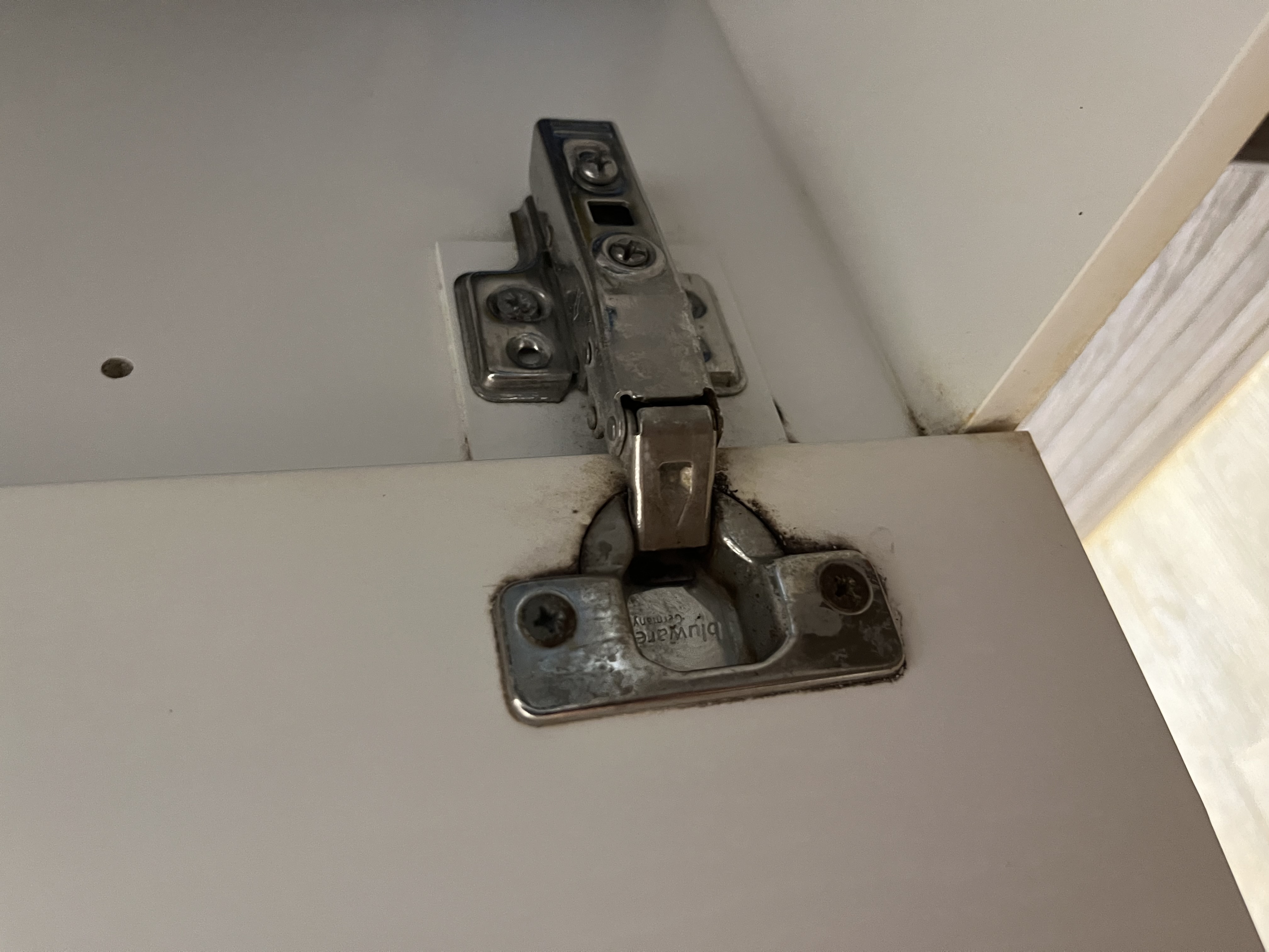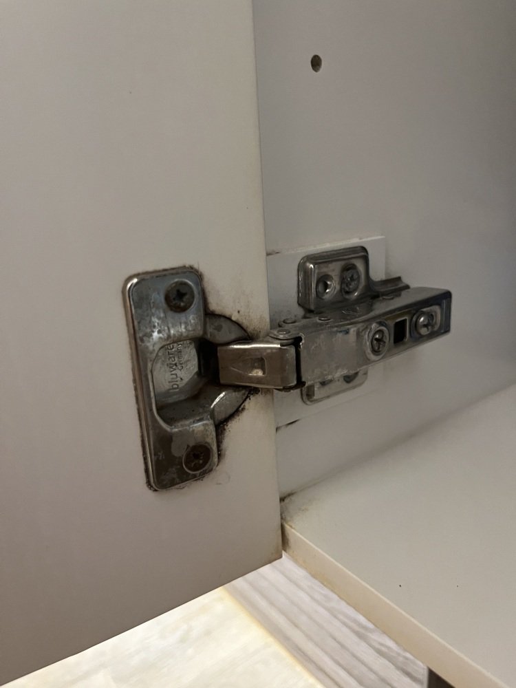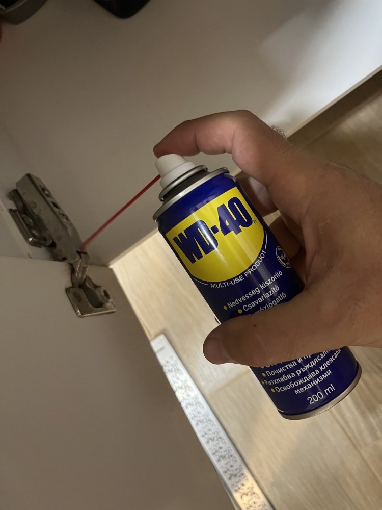 Шкаф на мивка в банята. Едната врата на шкафа се затваряше по-бавно и непълно преди да освежа пантите с WD-40.