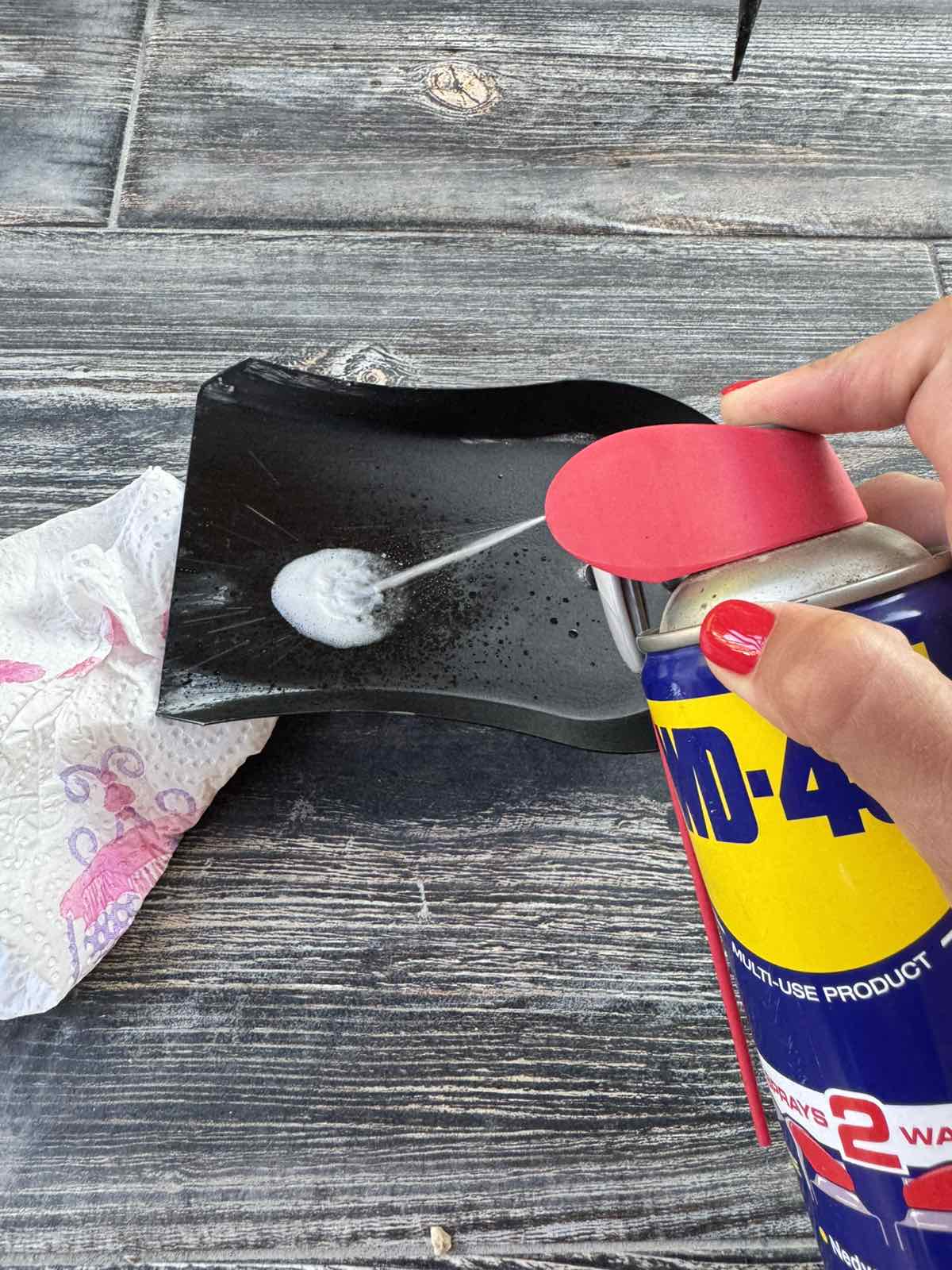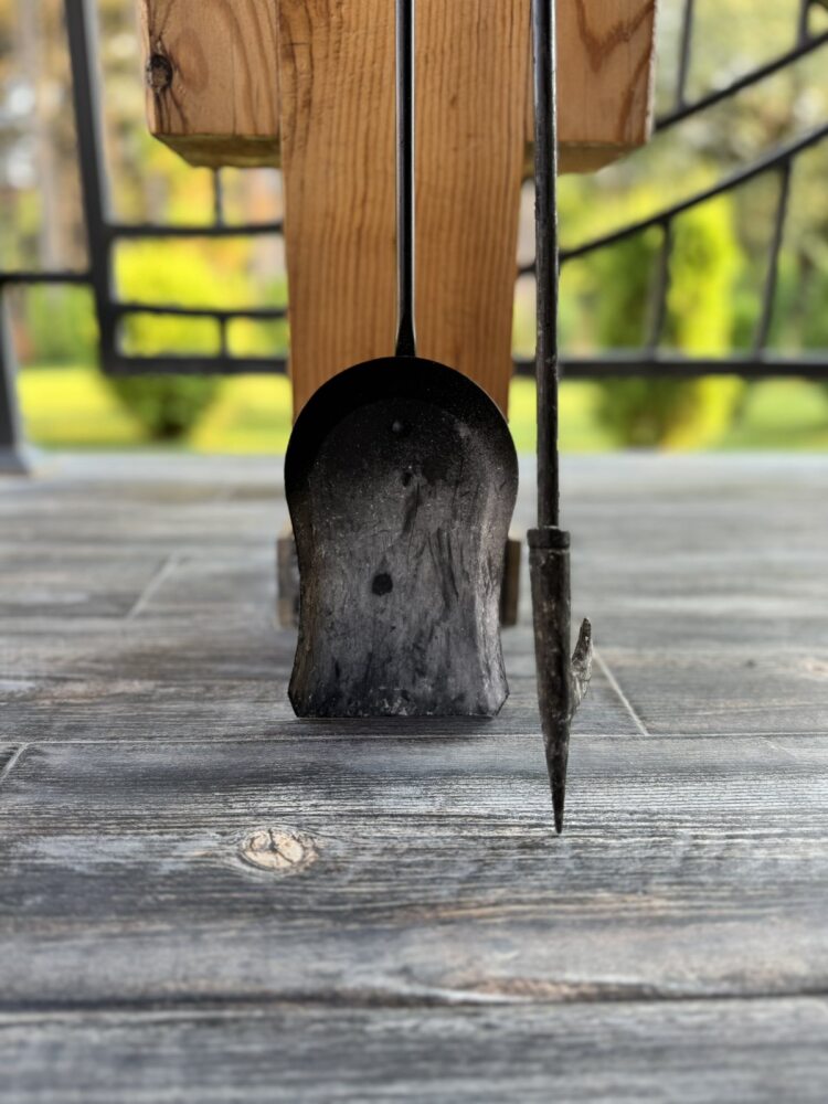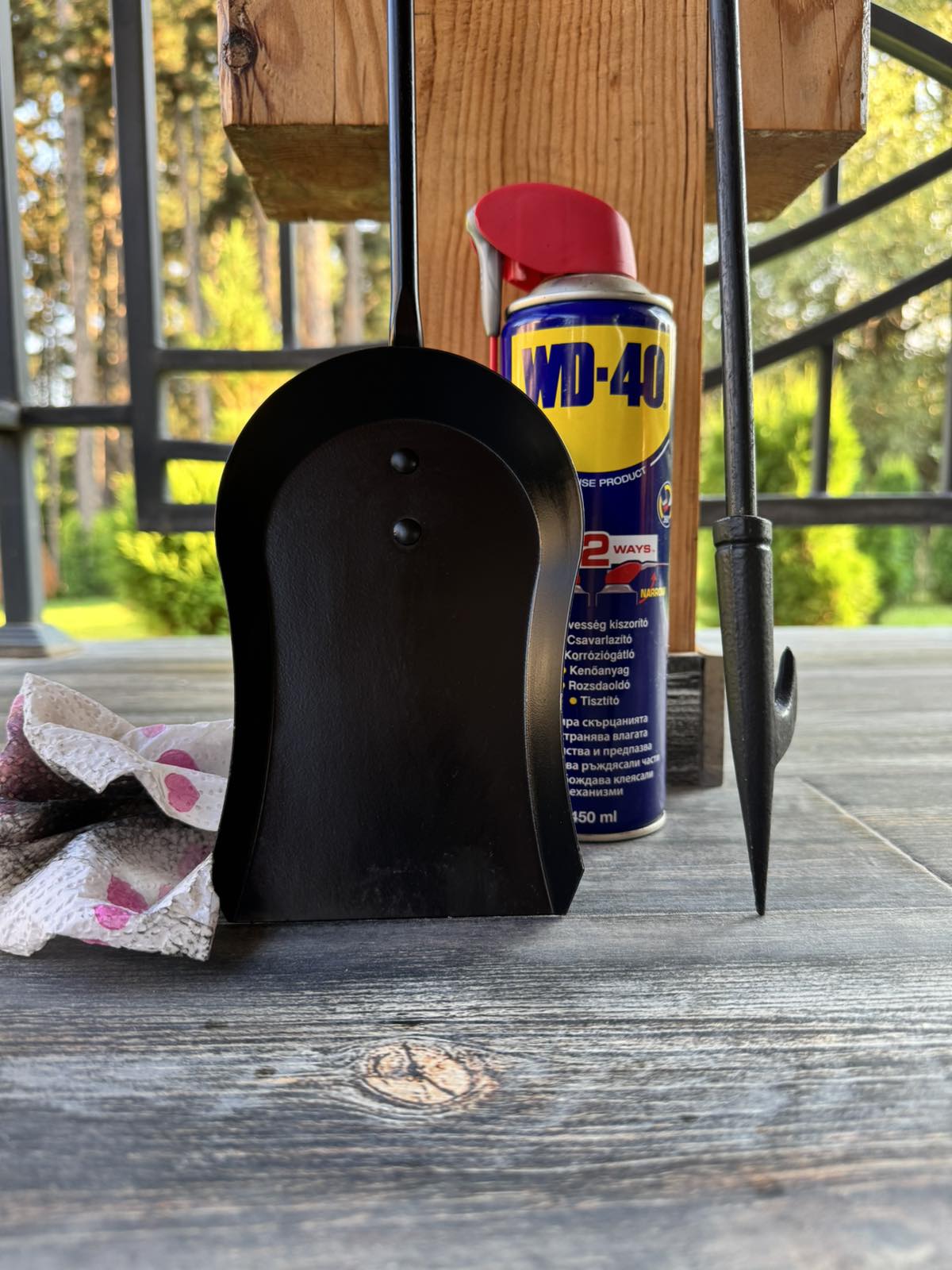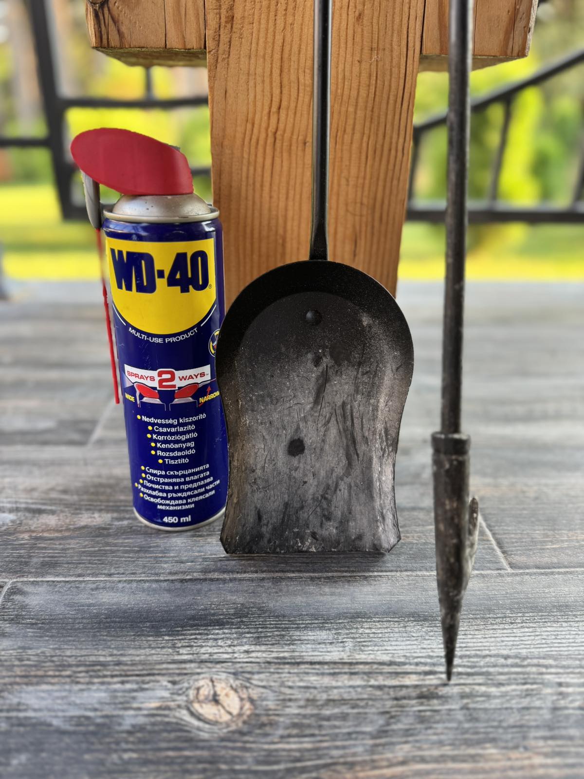 Аксесоарите ни за камина не бяха пипани (почиствани) от зимните месеци. Това е дълго време за появата на ръжда, особено когато металните инструменти се съхраняват във влажни помещения. С помощта на WD-40 ръждата по сгъвките беше отстранена с малко повече усилия. За допълнителната мръсотия то е ясно, тя изчезна за секунди.