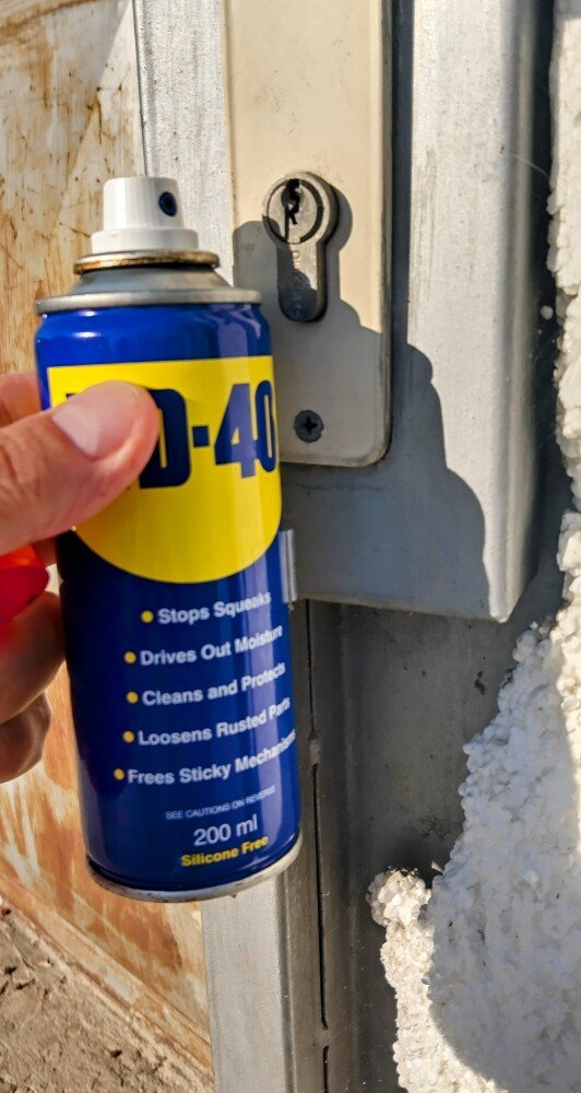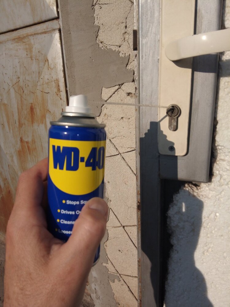 С помощта на флакон многофункционална смазка WD-40 и сламката към него беше почистена и смазана секретната брава на гаража. Тя е подложена на температурни амплитуди от -20 до +40 градуса, прах и вода. Смазването на патрона, дава възможност на ключа да се плъзга без проблеми и да му осигури дълги години сигурна работа и експлоатационен живот.