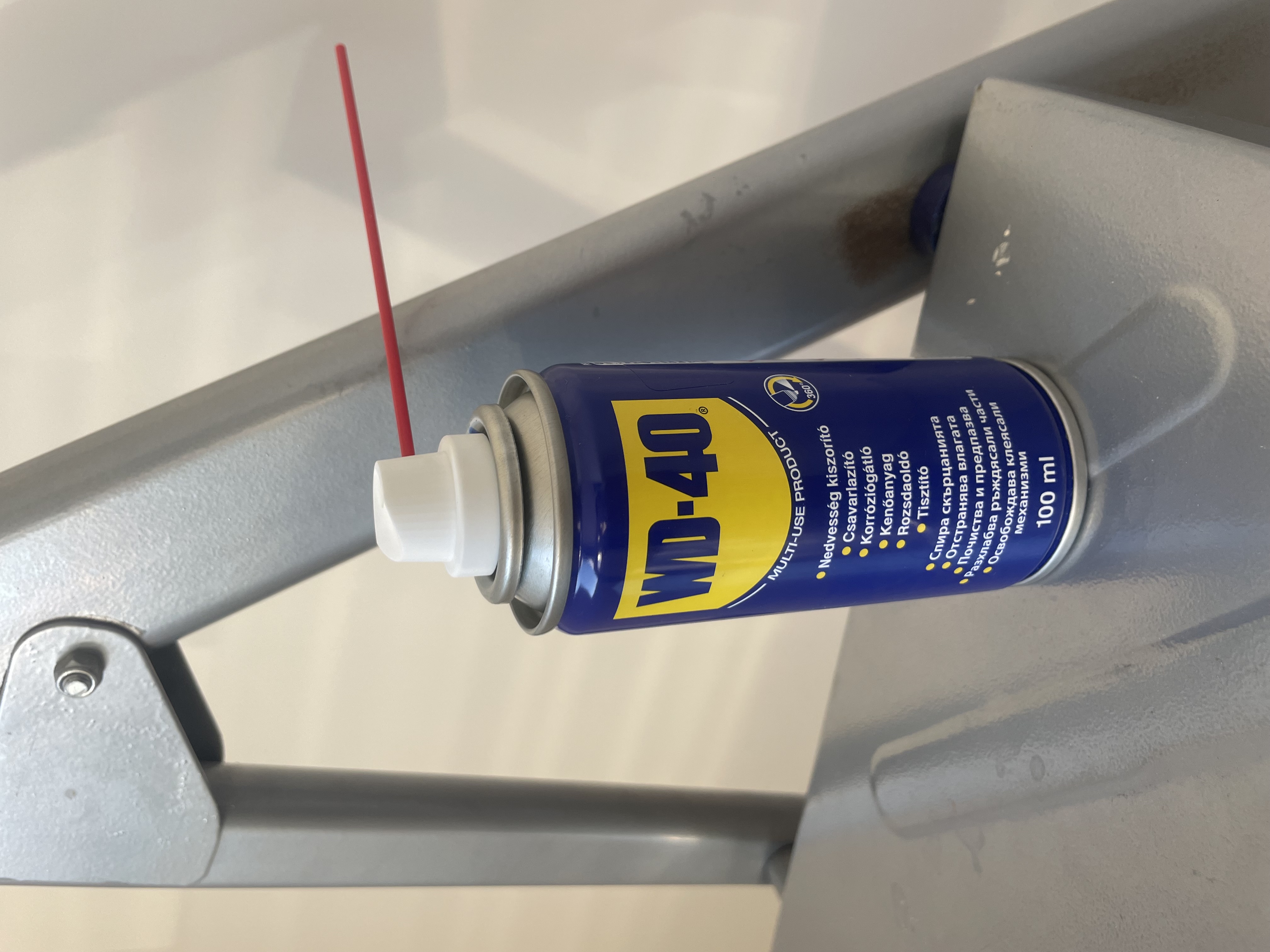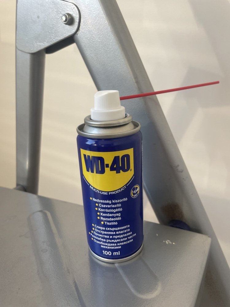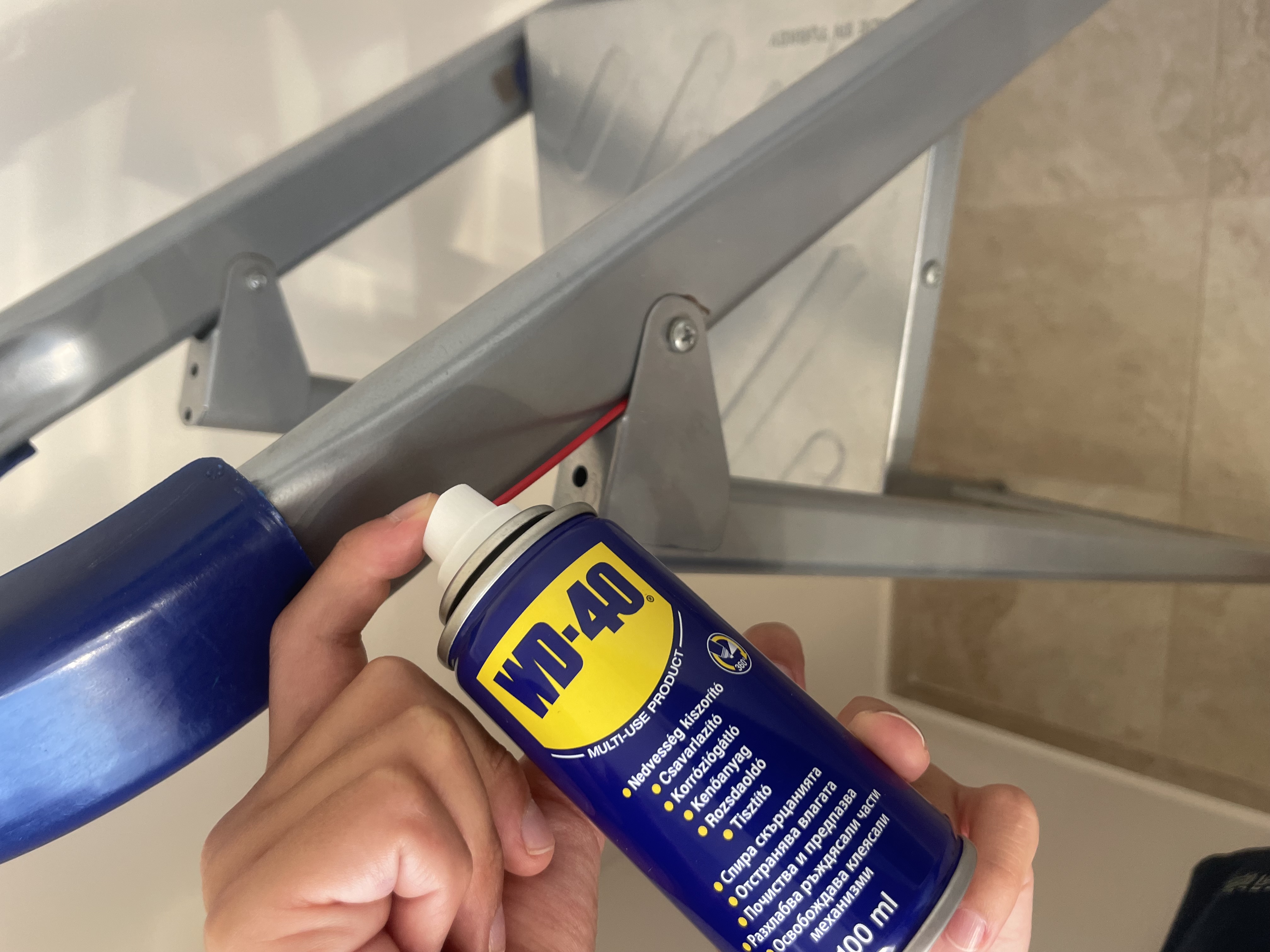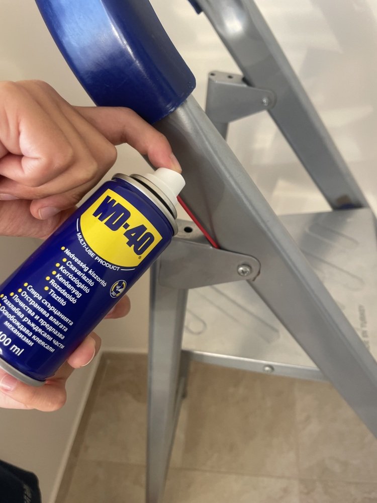 Тази стълба преживя няколко поредни ремонта. С времето се отваряше и затваряше все по-трудно. С WD-40 това движение вече е в пъти по-лесно.