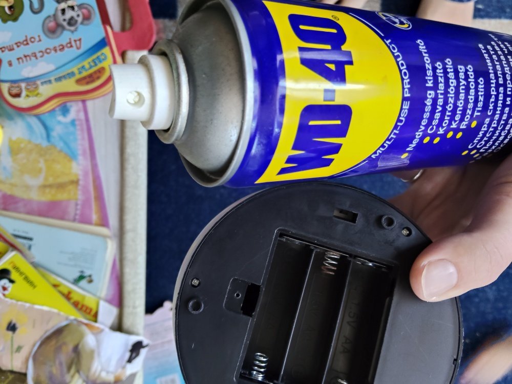 Нощната лампа на дъщеря ми изведнъж спря да работи. Като отворих да сменя батериийе видях, че едната пружина е ръждясала. Смених батериите, но не проработи, но след като я напръсках с WD-40, лампата светна :). И сега всички са шастливи.