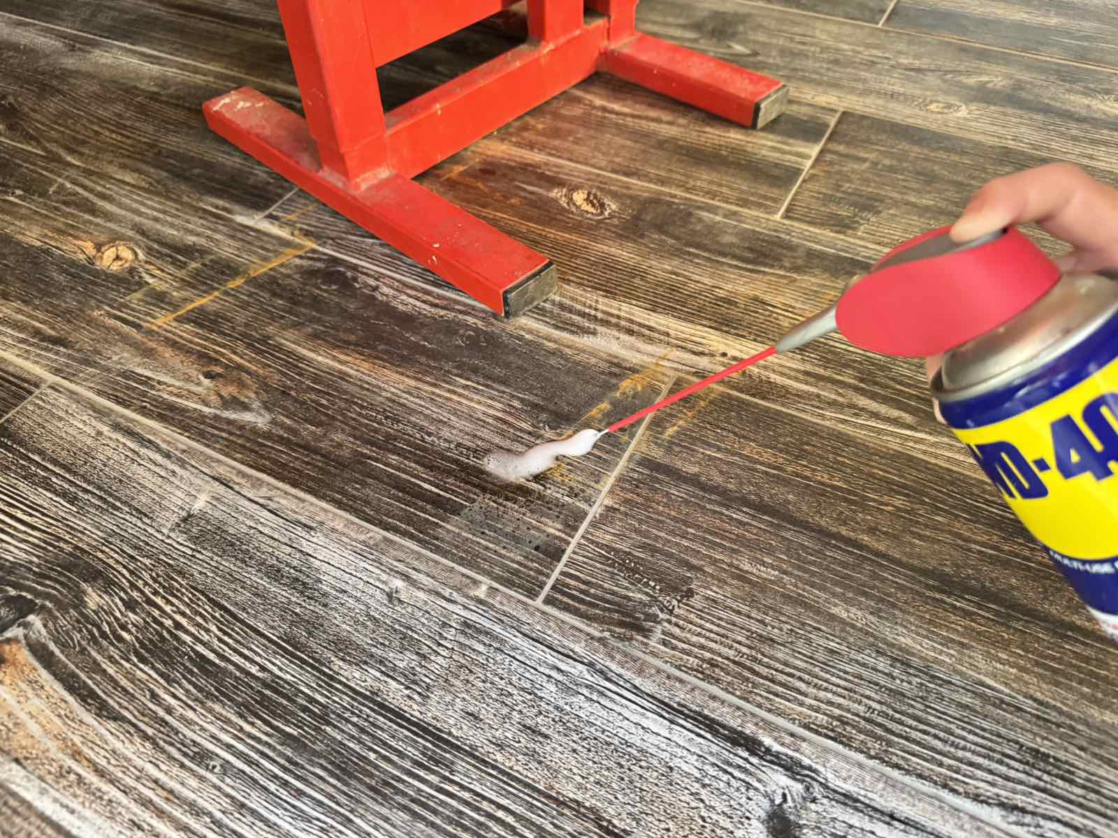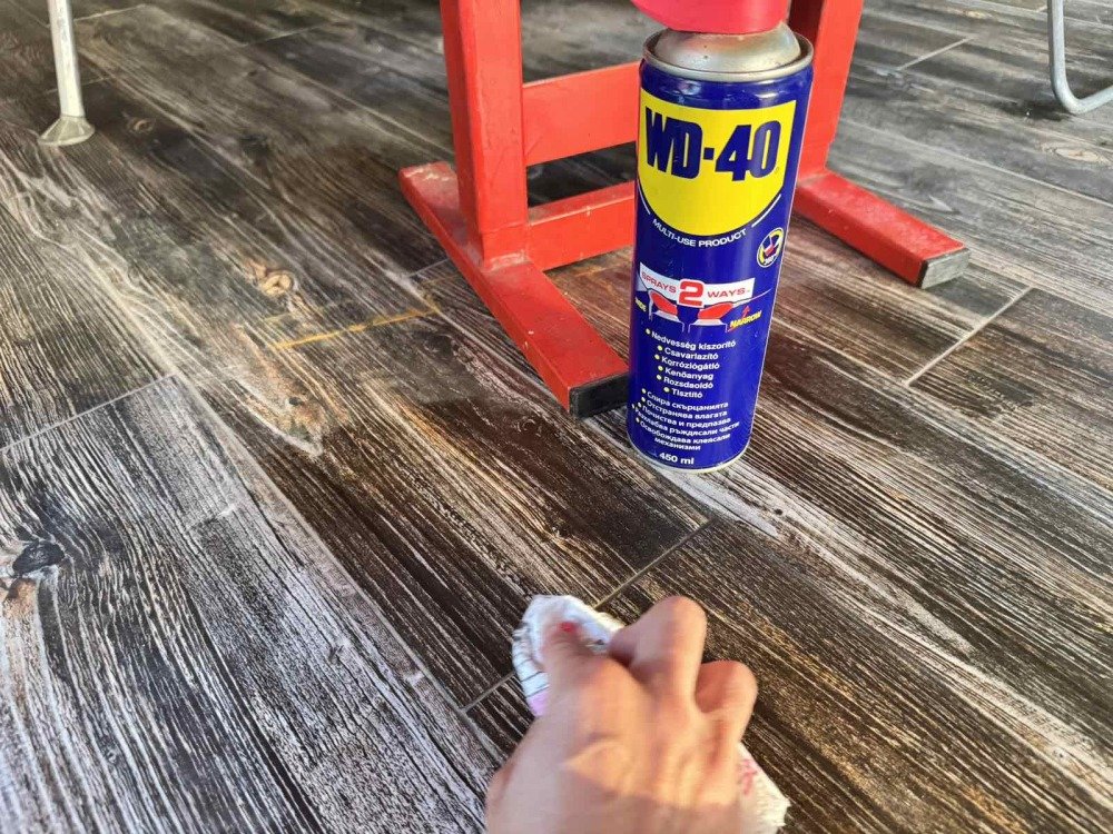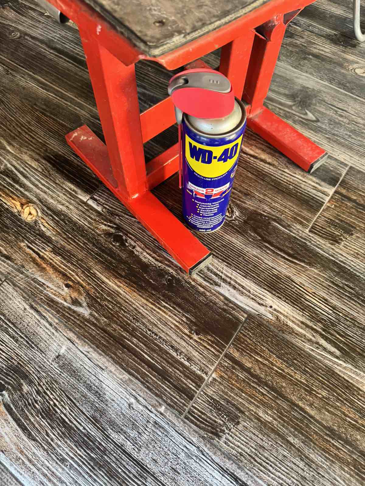 В продължение на месеци (от октомври до към средата на април) стойката на мотора е на студено, влажно и дъждовно време. Както и да го погледнеш, тя е изложена на променливи / неблагоприятни условия. Под нея се бяха образували ръждиви следи, които с помощта на WD-40 бяха отстранени. Благодарение на този продукт ръждата беше премахната от гранитогреса.