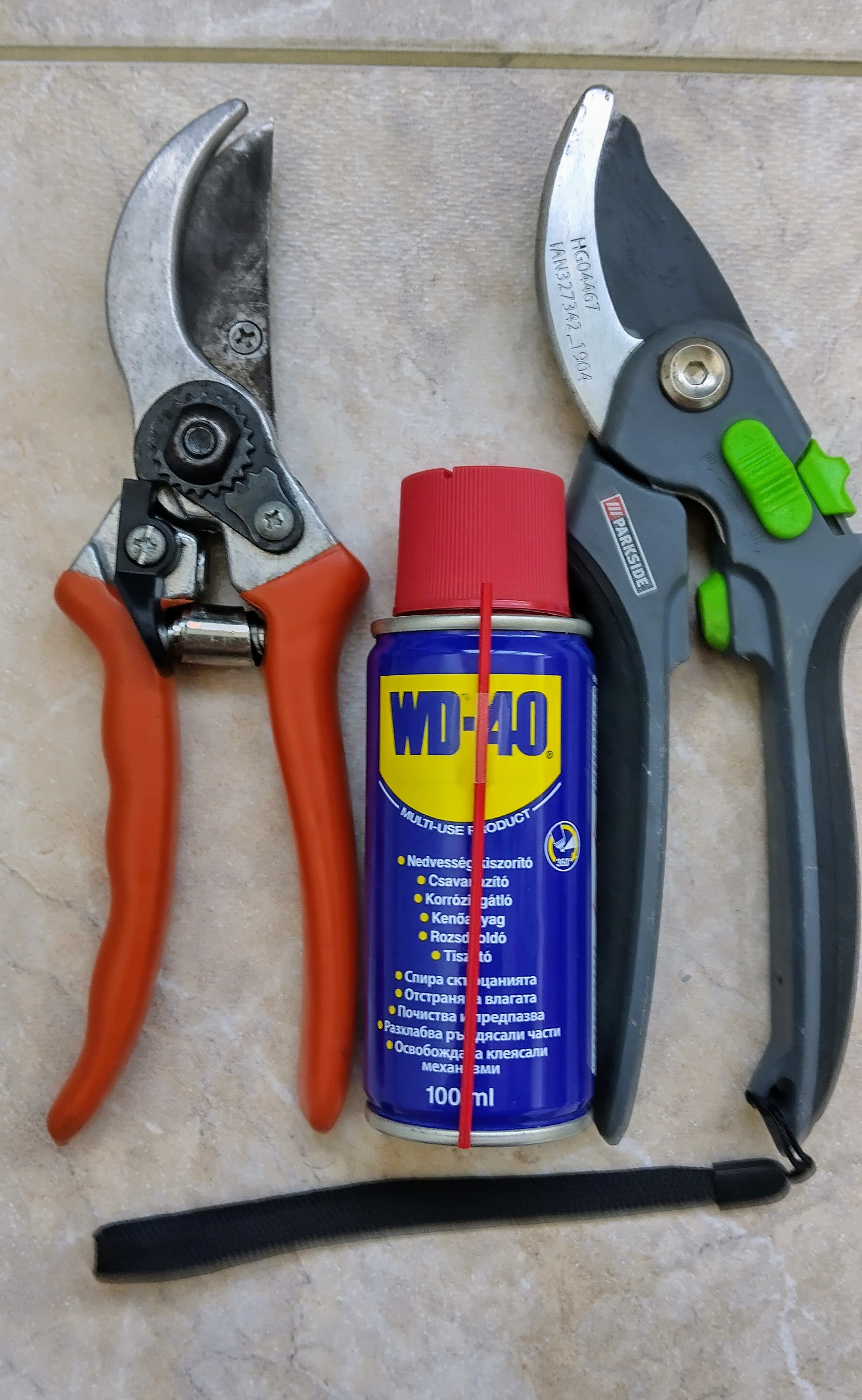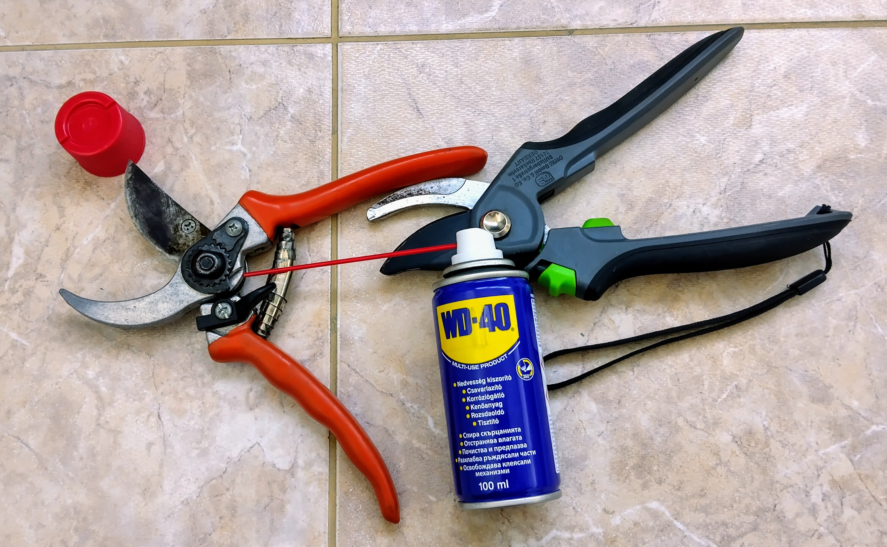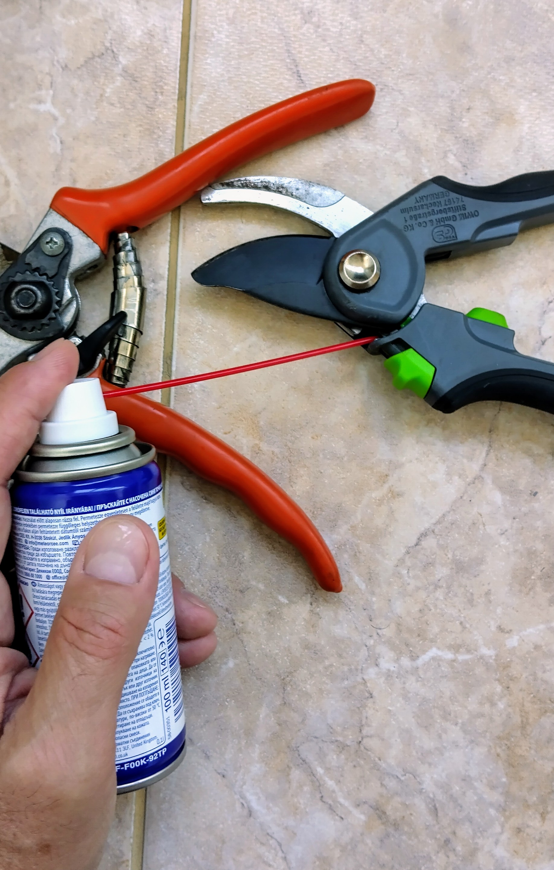 Тук след почистване, заточване и измиване следва смазване с мултифункционалната смазка WD40. Пръскаме в пружините и при оста на въртене и всичко е наред до следващото рязане на овошки, лозя и гроздобер.