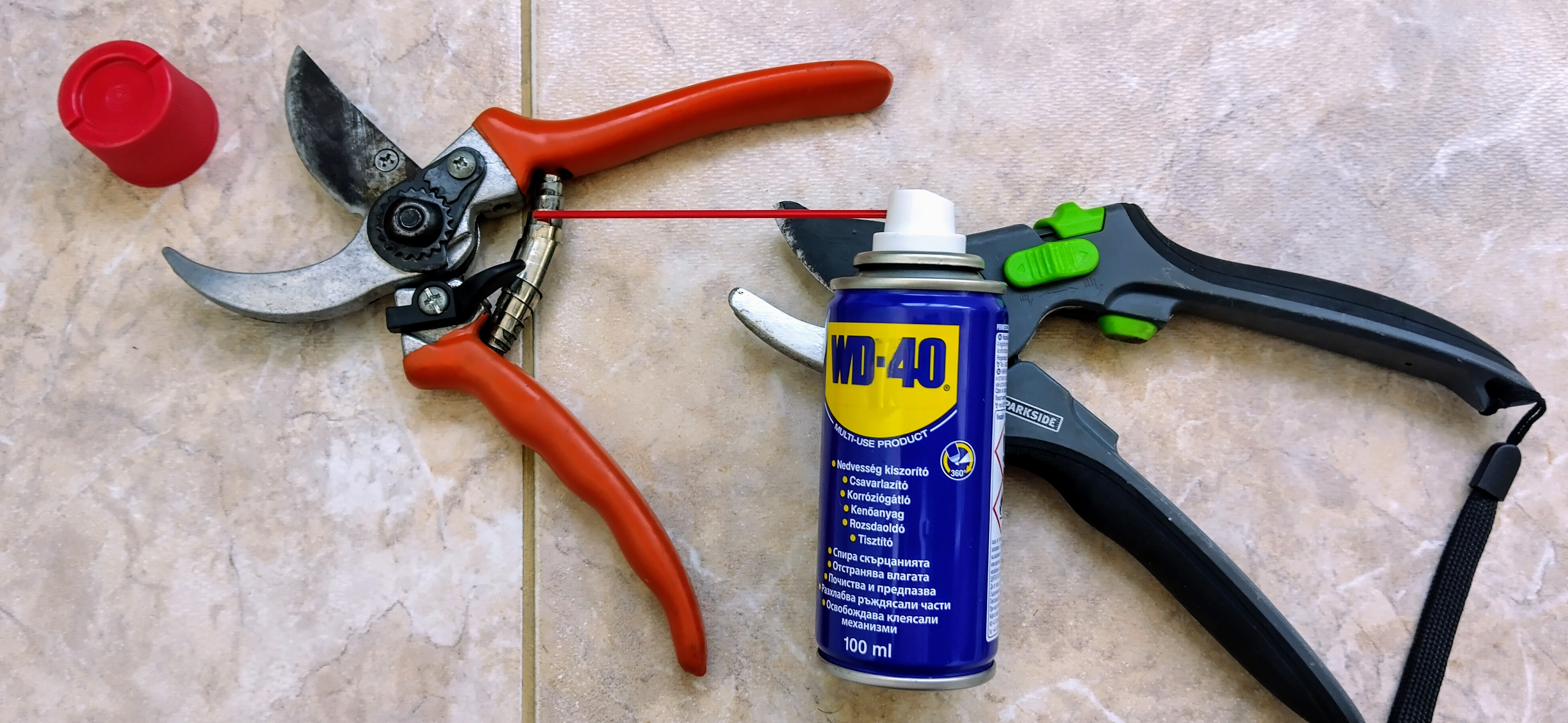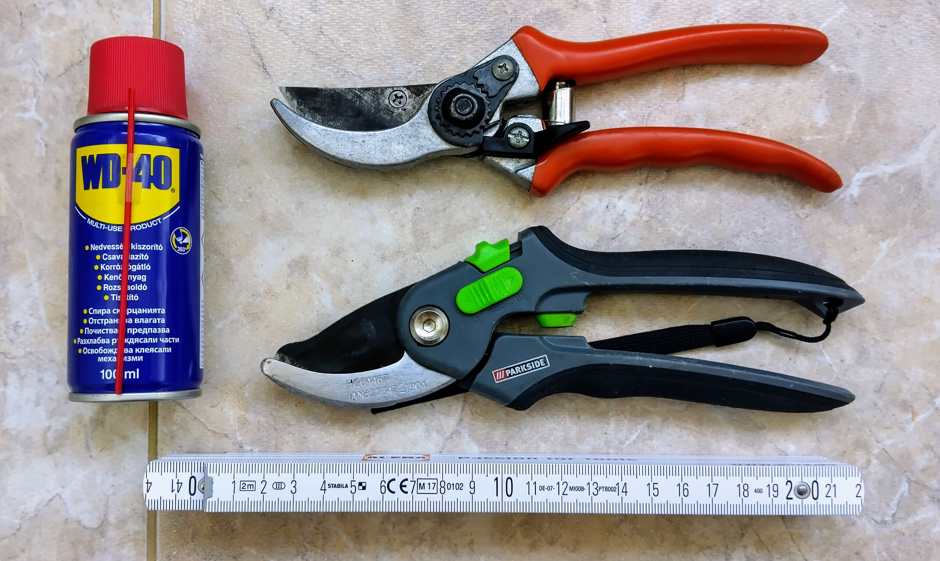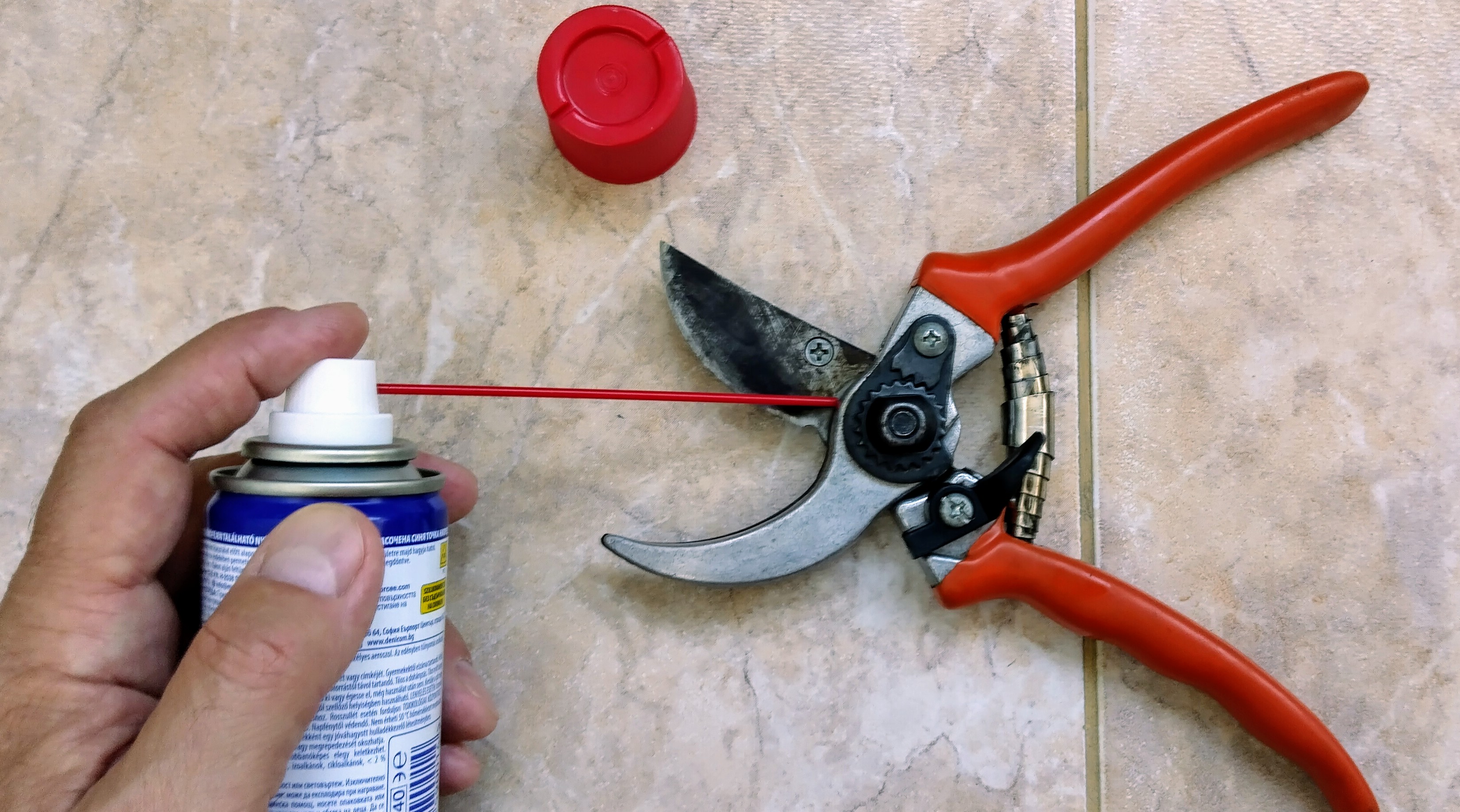 Тук след почистване, заточване и измиване следва смазване с мултифункционалната смазка WD40. Пръскаме в пружините и при оста на въртене и всичко е наред до следващото рязане на овошки, лозя и гроздобер.