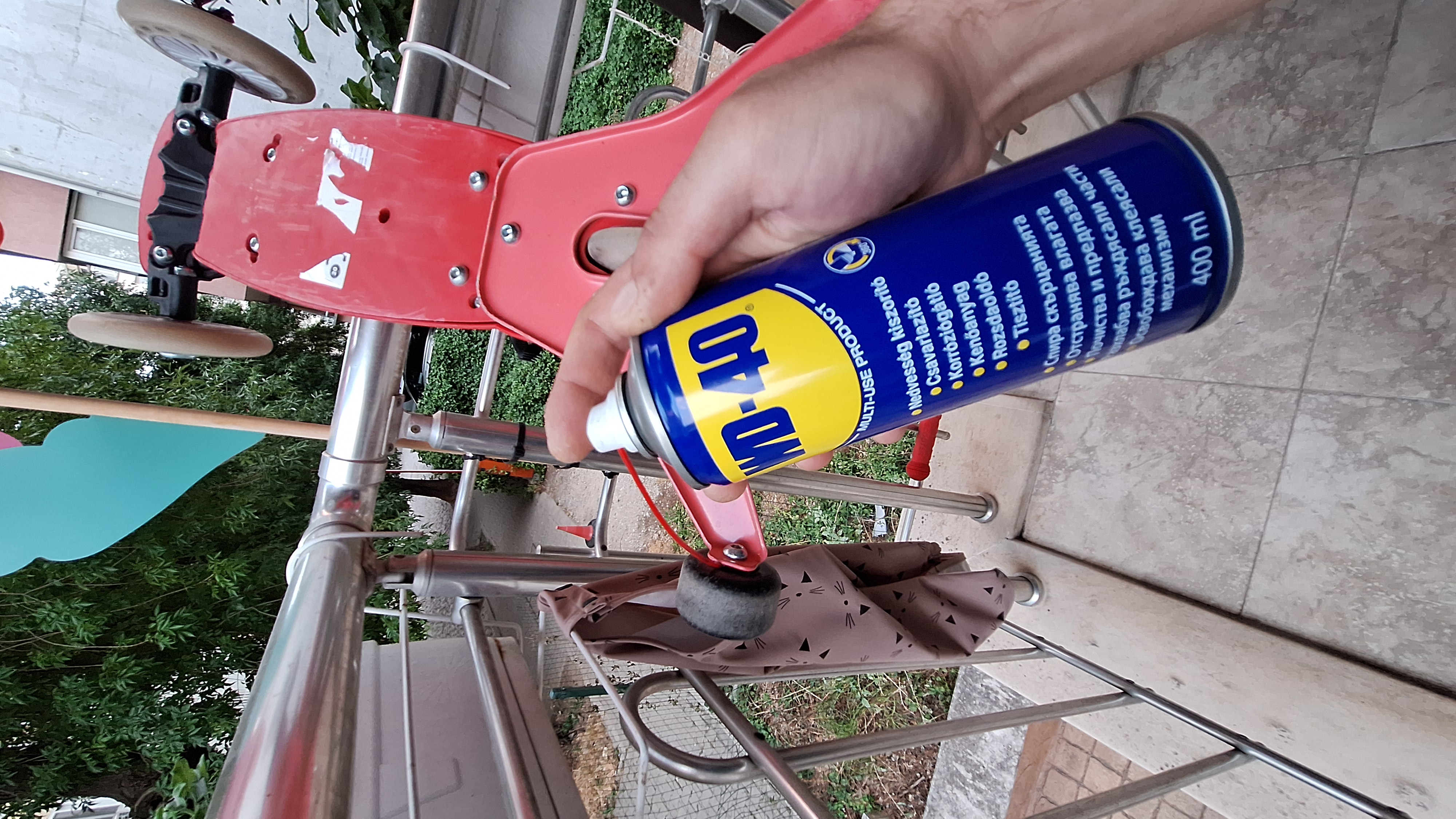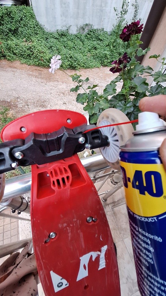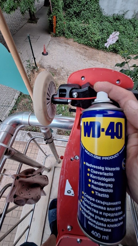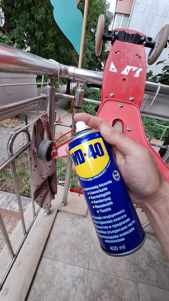 Смазах лагерите и кормилото на бебешката тротинетката на детето ми с WD40 и се възстанови гладкостта в движението и управлението и. След близо 1 год. определено вече имаше нужда...