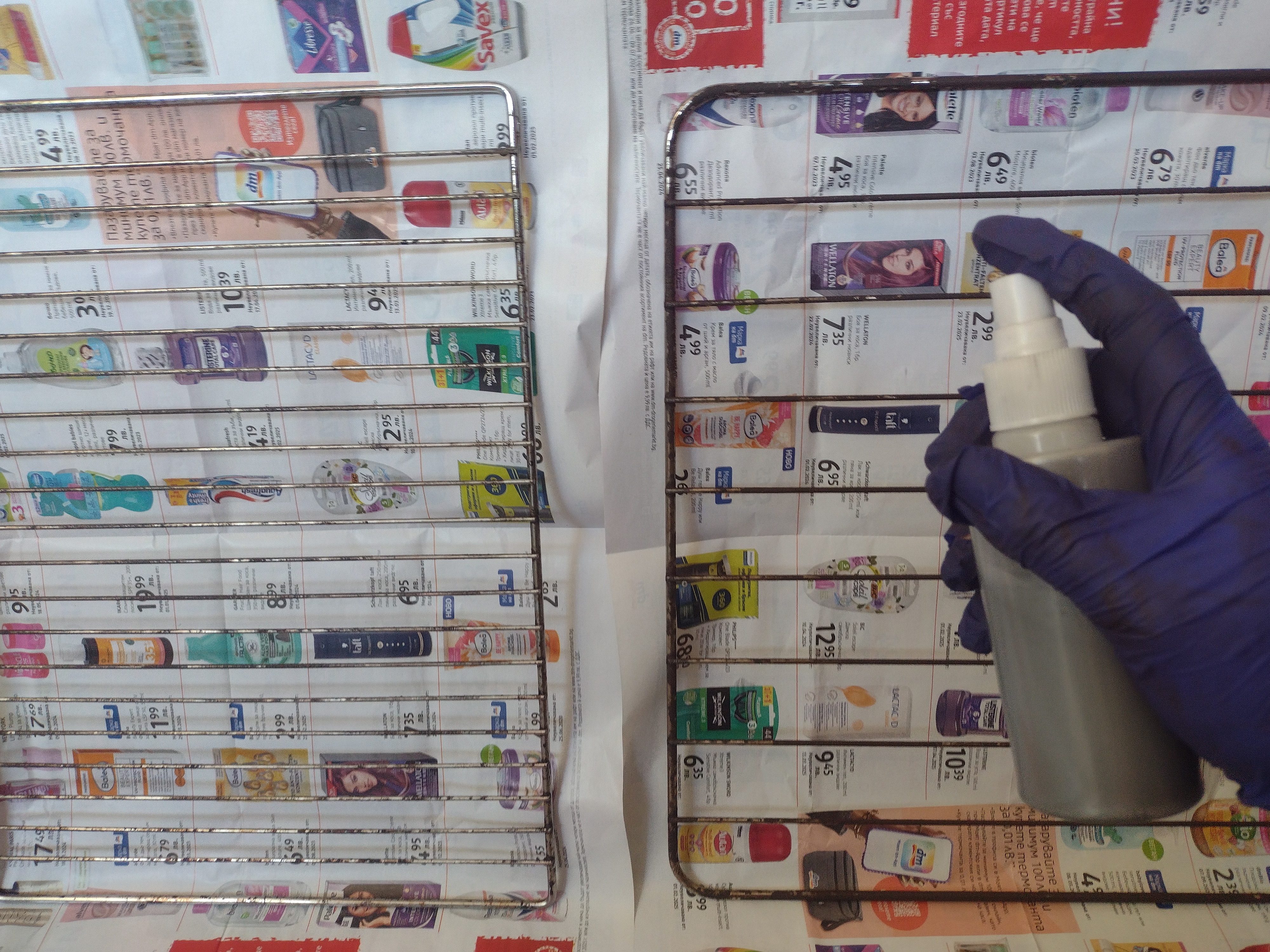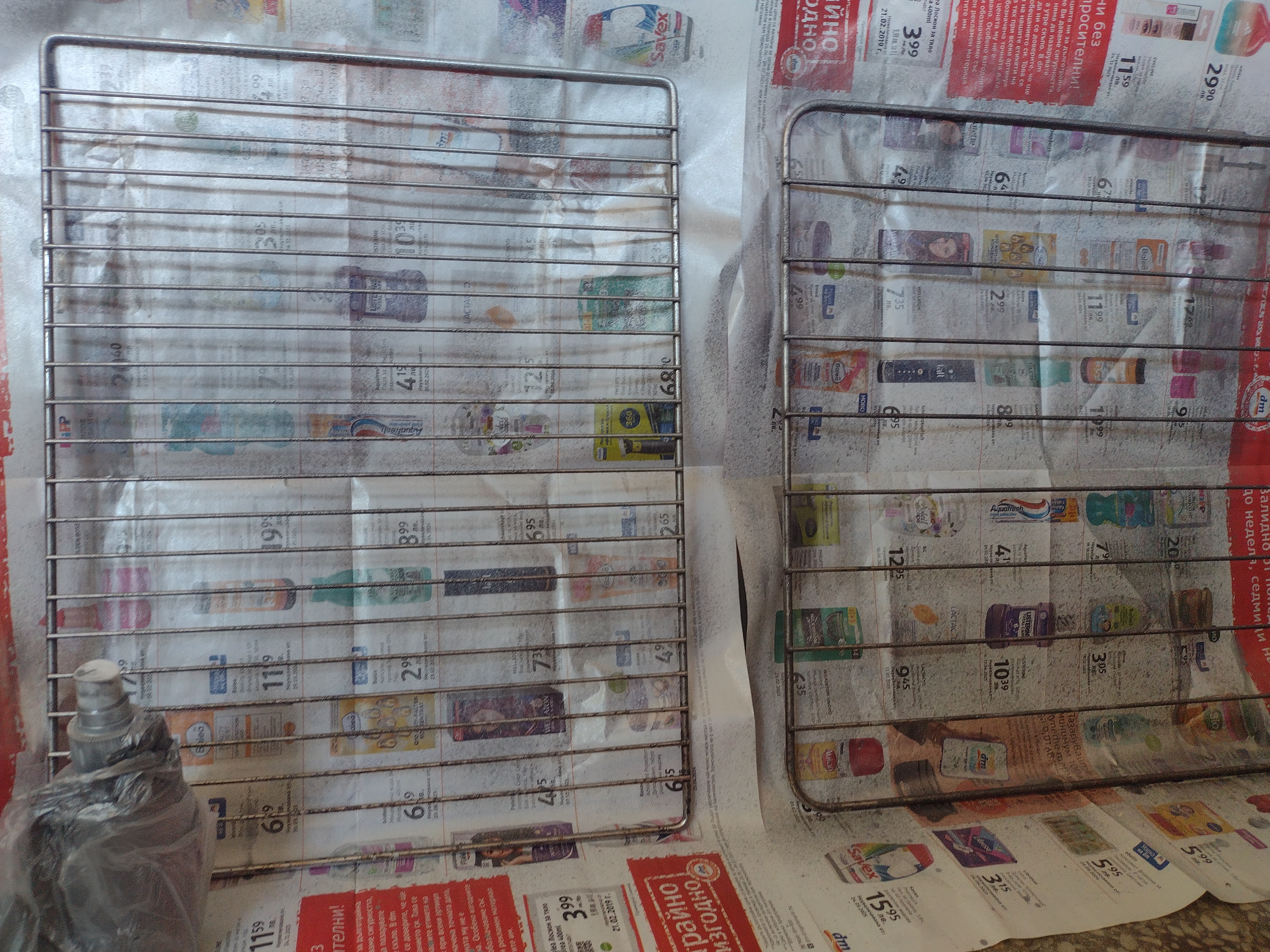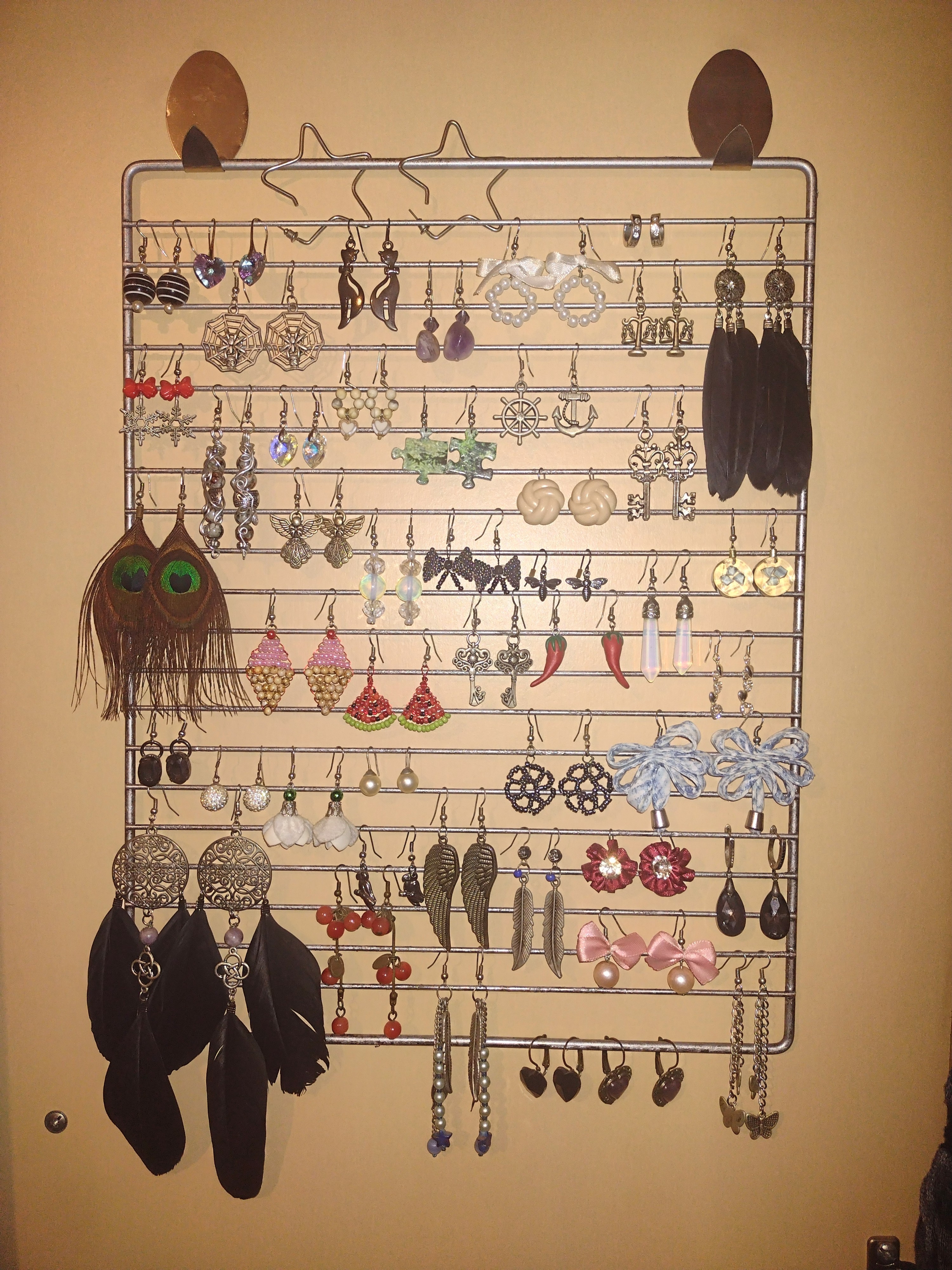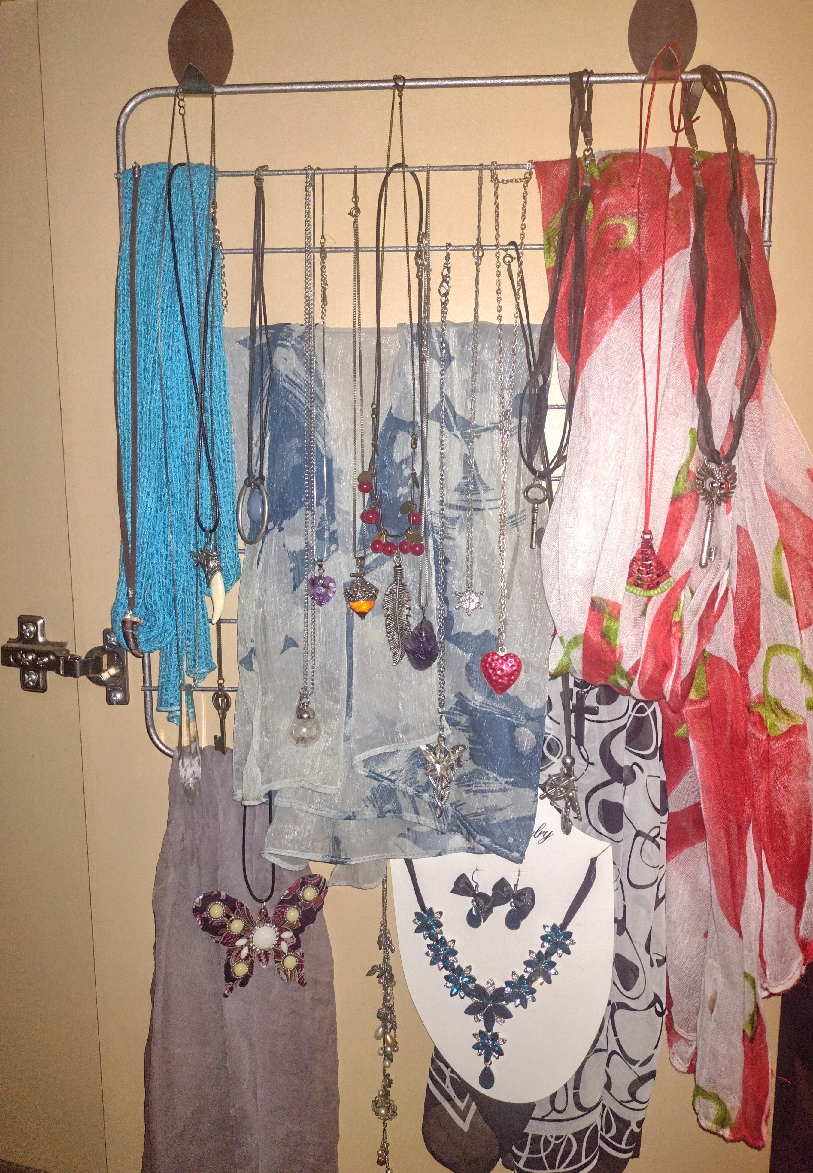 Разполагах с две стари скари от повредени готварски печки, които не бяха подходящ размер за новата печка, но не исках да ги изхвърлям. (Печките са предадени за рециклиране.) Използвах WD-40, за да премахна по-лесно замърсяванията и ръждата. За съжаление се оказа, че няма чиста основа и използвах бронз в спрей-флакон, за да възстановя добрия външен вид. След като скарите изсъхнаха (помогнах си с пистолет за горещ въздух), оставаше само да залепя закачалките в гардероба и да ги поставя. Бившите скари се превърнаха в практичен органайзер за бижута - за дами като мен, които не разбират израза "Имаш ДОСТАТЪЧНО" 😃